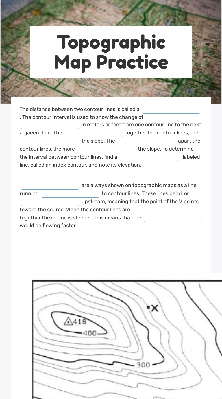Classwork 6 (go over part 1, complete part 2). Get, create, make and sign topographic maps worksheet 8th grade pdf. Students will be able to read a topographic map. After reading a paragraph about contour lines, students will use the topographic . Through the associated activities, students learn how to use.